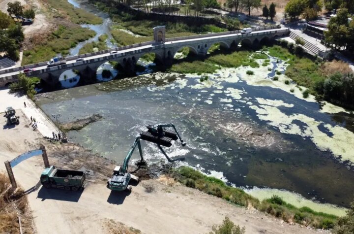 Kurak yaz ayları nedeniyle debisi düşen Tunca Irmağı, Edirne'de Devlet Su İşleri takımları tarafından...